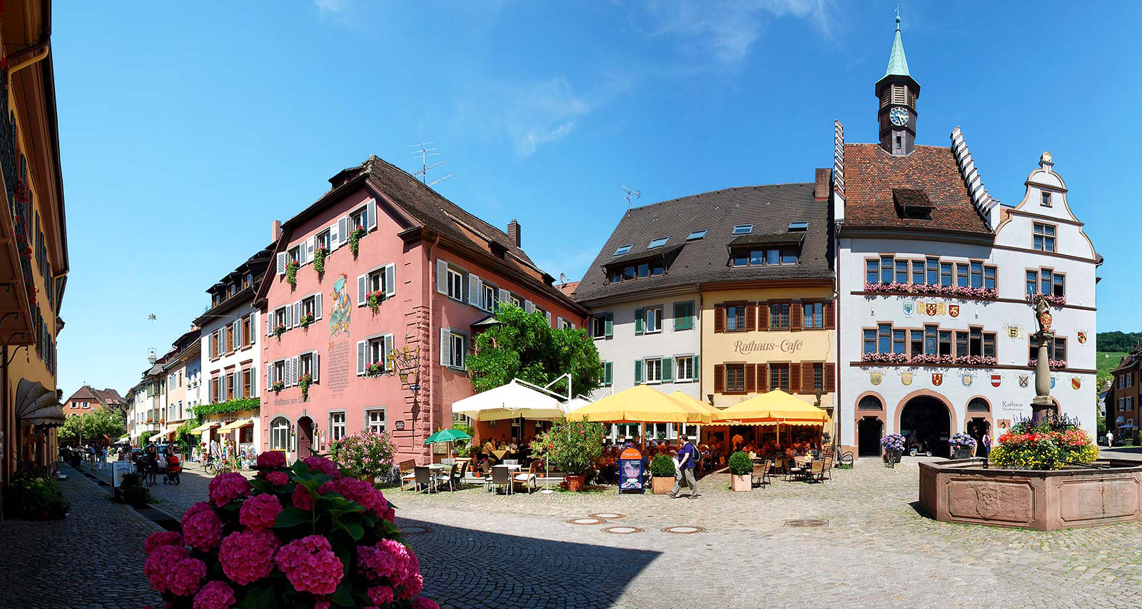 Eingebettet in die Landschaft zwischen Schwarzwald und Rheinebene liegt Staufen mit seiner historischen Altstadt und der Burg, von der man einen herrlichen Ausblick hat.